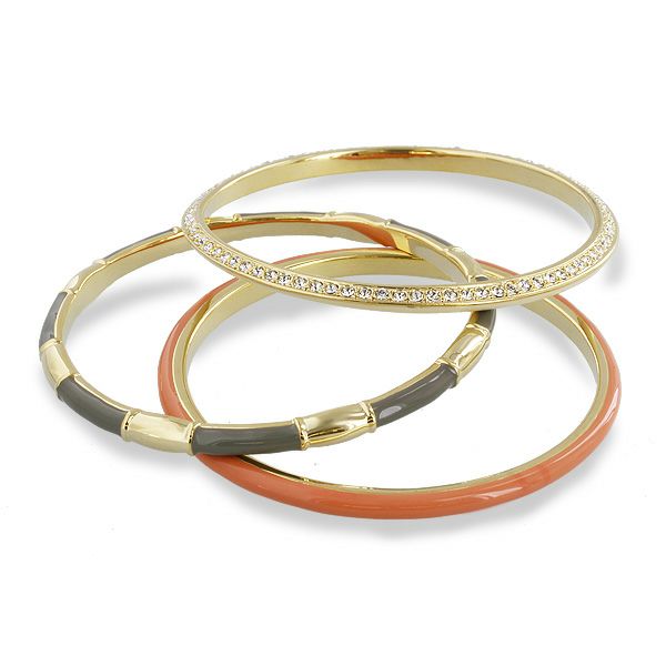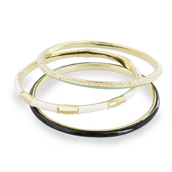 それぞれデザインの異なる3連バングル。1本ずつ独立しているので、お好みの本数や並べ方で着けることができます。クリスタルガラスの付いたバングルの裏側はエナメルのカラーリング。どちらを見せるかで印象の変化も楽しめます。