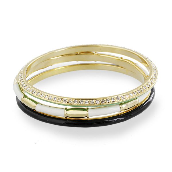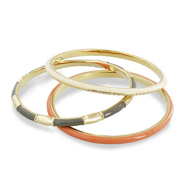 それぞれデザインの異なる3連バングル。1本ずつ独立しているので、お好みの本数や並べ方で着けることができます。クリスタルガラスの付いたバングルの裏側はエナメルのカラーリング。どちらを見せるかで印象の変化も楽しめます。