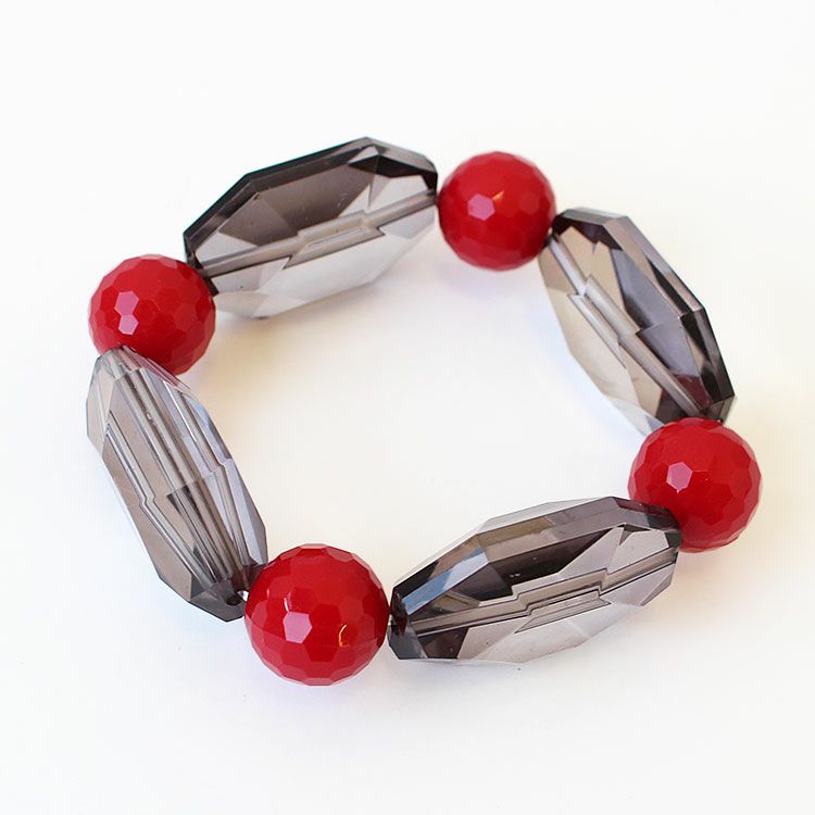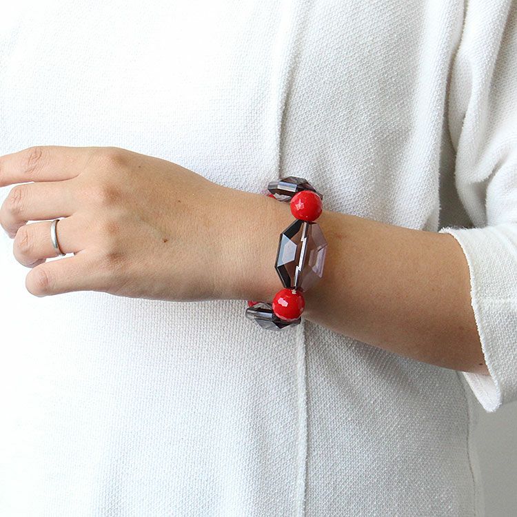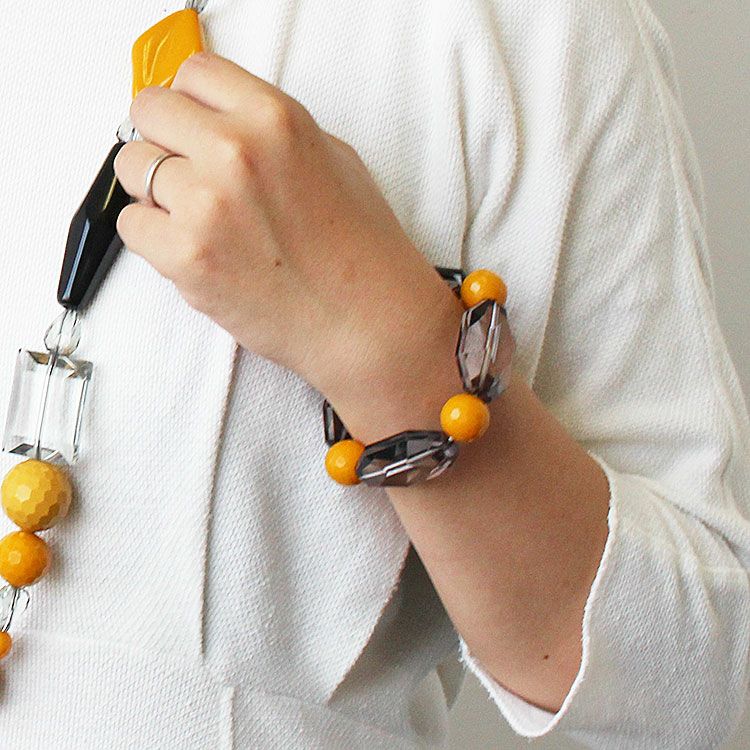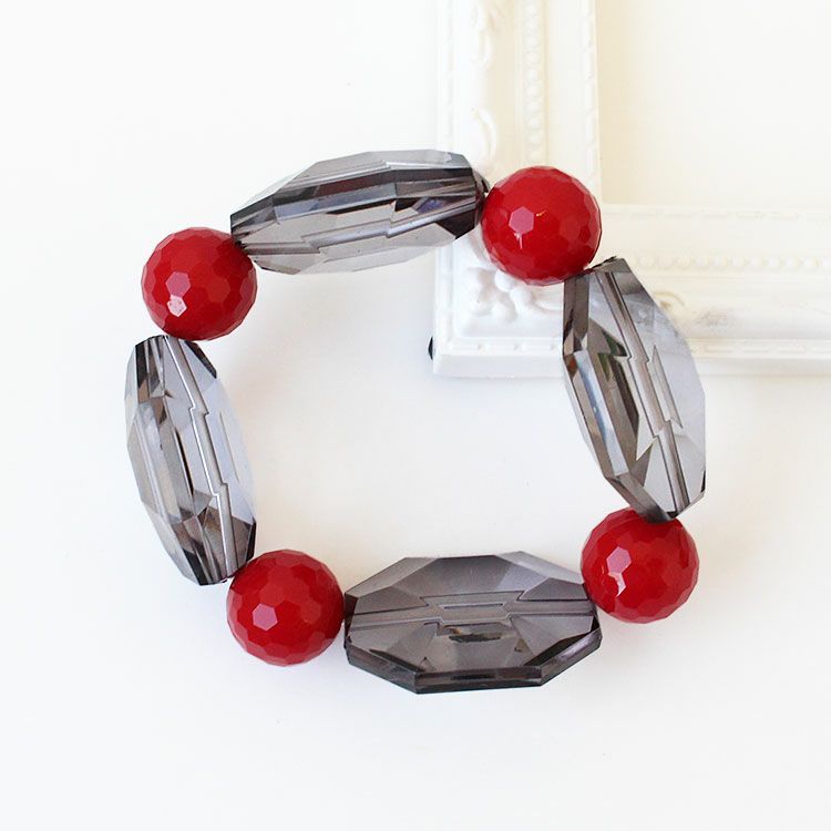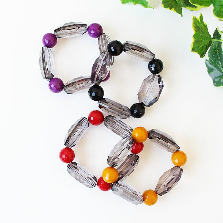 カッティングが美しい大ぶりのアクリルビーズを組み合わせたブレスレット。着けた瞬間しっくりと馴染みオシャレ見えするデザインが魅力です。ゴムタイプのため着脱がスムーズです。