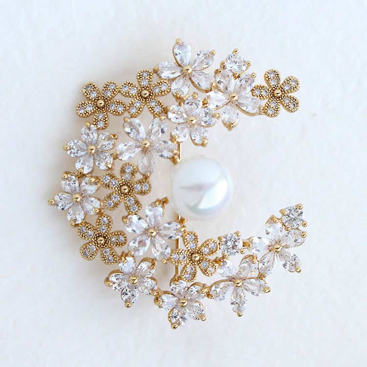 キュービックジルコニア×パール三日月モチーフデザインブローチ