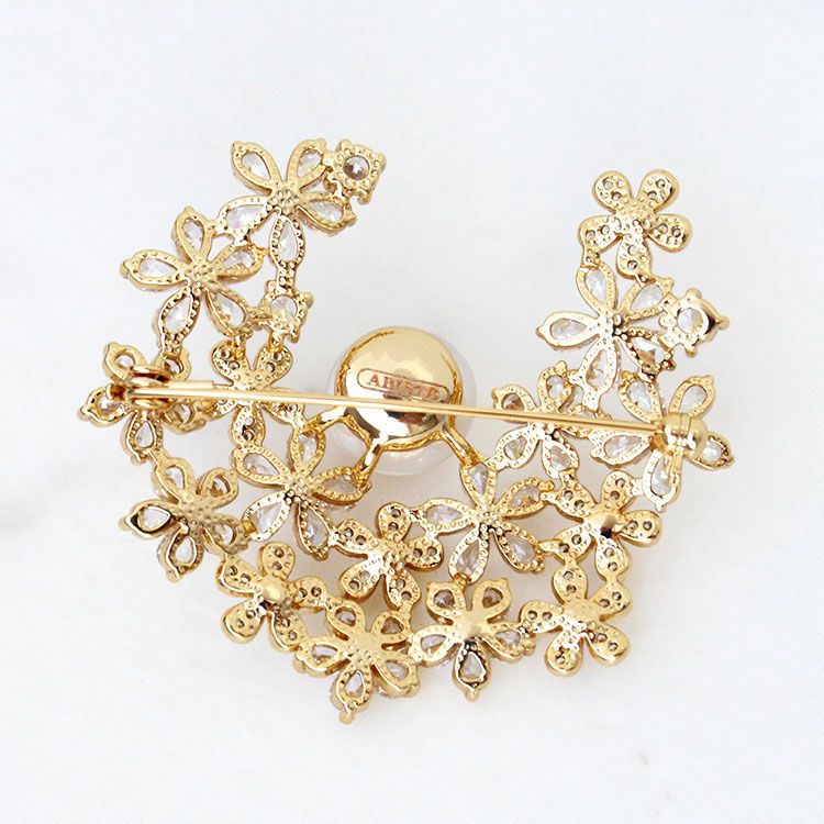 立体的なお花にパールを組み合わせたエレガントなハーフムーンブローチ。キラキラと輝くキュービックジルコニアが、グッと華やかで洗練された印象をプラスしてくれます。ニットやコートなどに合わせた日常使いから、セレモニーやオケージョン、パーティーシーンなど、幅広くご利用いただけます。ご自身用やギフトにもおすすめです。