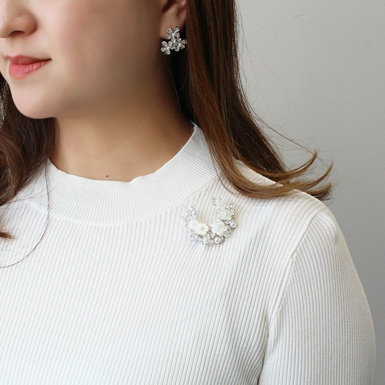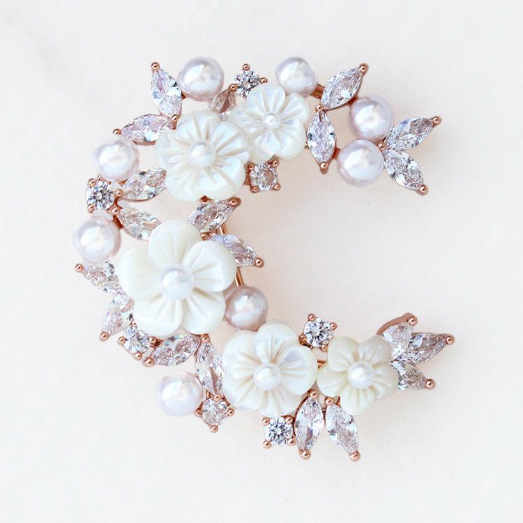 マザーオブパール(MOP)のお花に小さなパールを組み合わせたエレガントなハーフムーンブローチ。キュービックジルコニアの葉っぱが華やかで洗練された印象をプラスしてくれます。ニットやコートなどに合わせた日常使いから、セレモニーやオケージョン、パーティーシーンなど、幅広くご利用いただけます。ご自身用やギフトにもおすすめです。