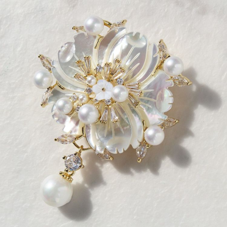 マザーオブパール(真珠母貝)でお花を模った、柔らかな虹色の輝きが美しいブローチ。シェルパールや大小のキュービックジルコニアが花を添え、立体感と輝きが華やかさを演出します。フォーマルにもデイリーにも使いやすいデザイン。
