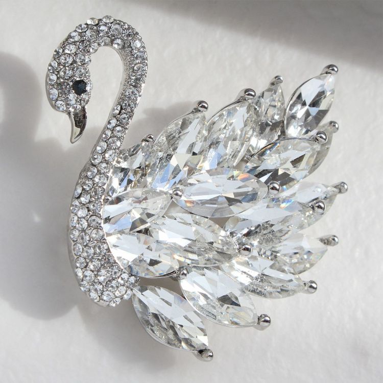 美しい白鳥をモチーフにしたブローチ。大粒のリーフ型クリスタルガラスで立体的に作られた羽が華やかなデザインです。