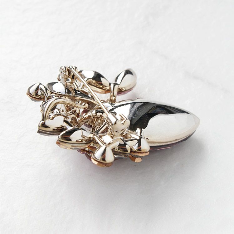 大粒のドロップ型クリスタルガラスに花を生けたような、華やかなブローチ。パープルやグレー、ライトブラウンと様々な色を組み合わせた落ち着きのあるマルチカラーなので、合わせる服や小物の色を選びやすいのも嬉しいポイントです。もちろんシンプルな服のアクセントにも。