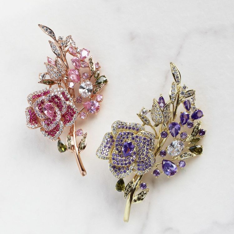 色鮮やかなキュービックジルコニアをたっぷりとあしらった華やかなバラモチーフのブローチ。大きめのサイズでコーディネートのアクセントに。ステージやパーティーにもおすすめです。