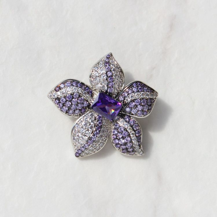 クリアとアメジストパープルのキュービックジルコニアをたっぷりと敷き詰めた、フラワーモチーフブローチ。やや小ぶりながら華やかさがあるので、シャツの襟元や帽子のワンポイント、スカーフ留めなどに使用したり、複数使いを楽しむのもオススメ。