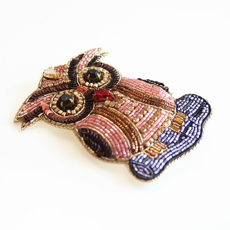 繊細なビーズ刺繍が施されたオウルビーズブローチ。軽量のため、お洋服はもちろん、スカーフ留めやニット帽、マフラー、バッグなど、どんなアイテムでもご使用いただきやすいのが特徴です。