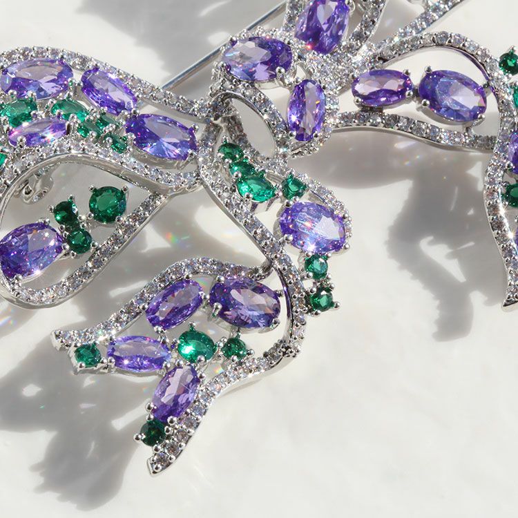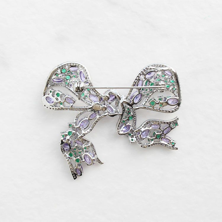 普段使いもセレモニーにも使いやすく人気のリボンモチーフブローチ。風に揺れるリボンのような柔らかいフォルムが繊細でフェミニン。パープルとグリーンのストーンを組み合わせることでシックで上品な印象をプラスされているので、甘さ控えめのファッションがお好きな方にもおすすめできるデザインです。