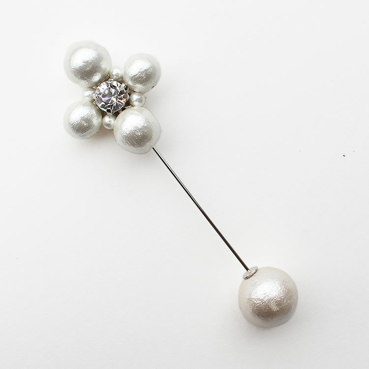 やさしげな肌触りと独特の風合いが魅力の、コットンパールのピンブローチ。大粒パールをフラワーに見立てたデザインは、中央に大きなビジューがキラリと煌めき、華やかな装いにピッタリ。パーティーからデイリーまで幅広くご使用いただけます。