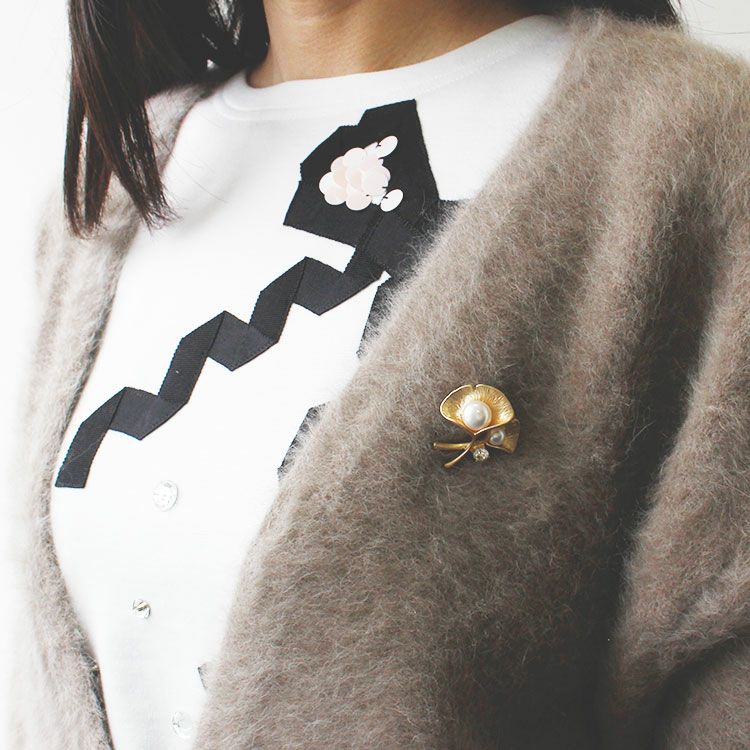 パールとクリスタルガラスをあしらった、銀杏ブローチ。 マットなメタルを使用しているので、ギラギラ感がなく落ち着いた大人のワンポイントにおすすめのアイテムです。