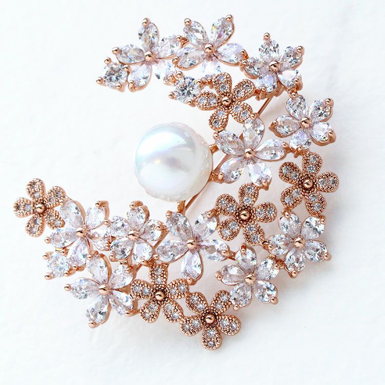 立体的なお花にパールを組み合わせたエレガントなハーフムーンブローチ。キラキラと輝くキュービックジルコニアが、グッと華やかで洗練された印象をプラスしてくれます。ニットやコートなどに合わせた日常使いから、セレモニーやオケージョン、パーティーシーンなど、幅広くご利用いただけます。ご自身用やギフトにもおすすめです。