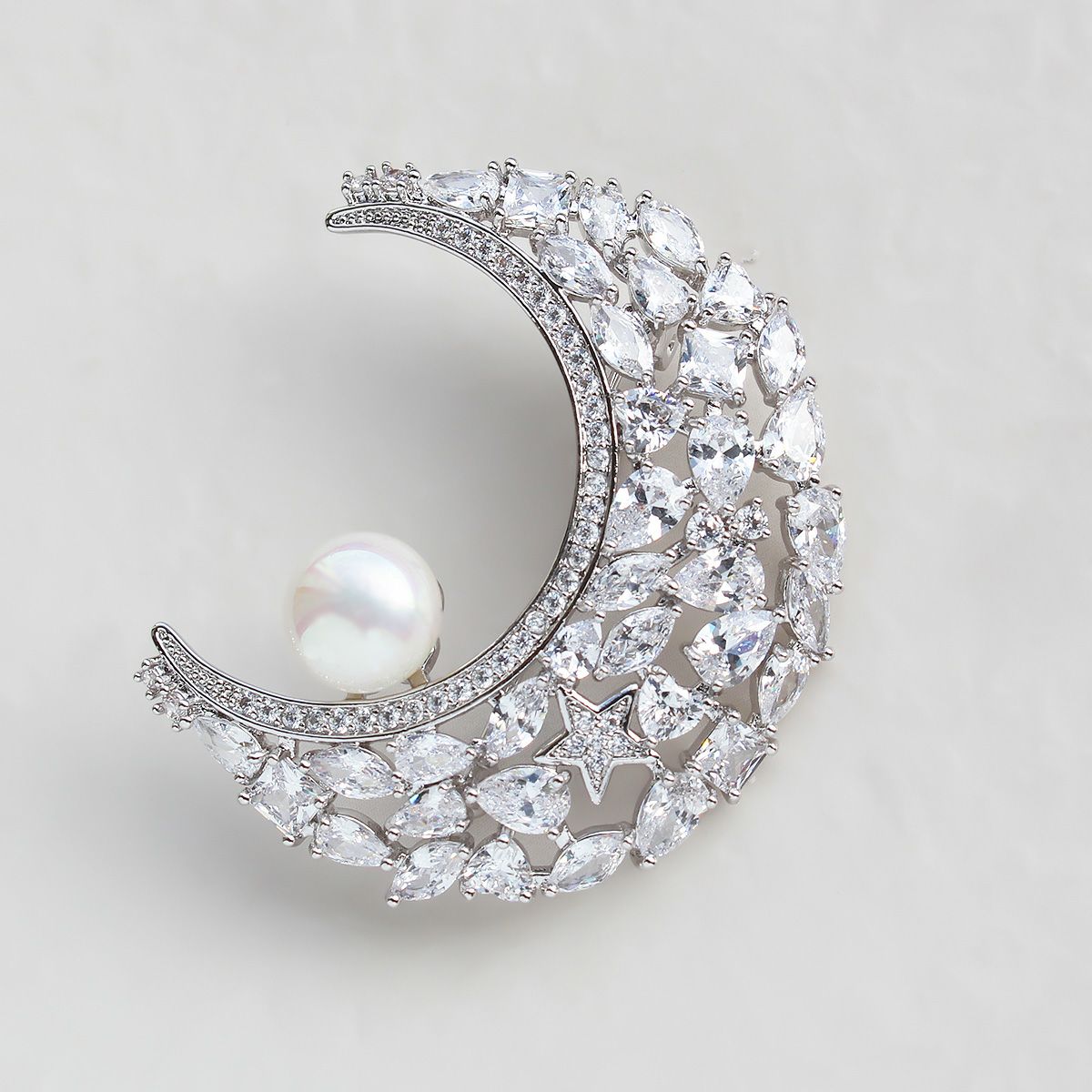 キュービックジルコニア×パール三日月モチーフデザインブローチ