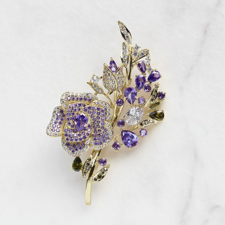 色鮮やかなキュービックジルコニアをたっぷりとあしらった華やかなバラモチーフのブローチ。大きめのサイズでコーディネートのアクセントに。ステージやパーティーにもおすすめです。