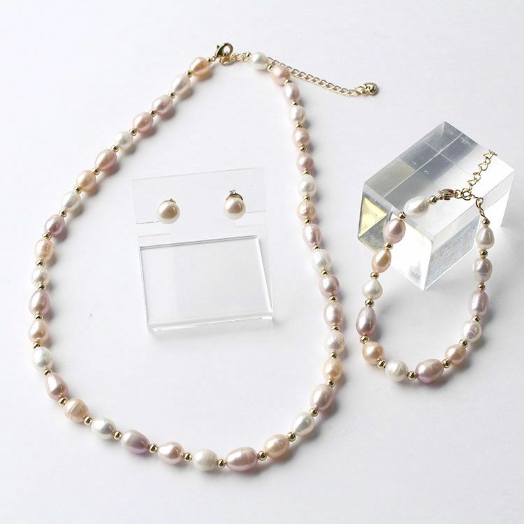 優しいライトピンク系のバロックパールを使った上品な淡水パールのネックレス、ブレスレット、ピアスの3点セット。淡水パールと淡水パールの間のゴールドパーツが華やかさをプラスしています。花嫁がつけるブライダルアクセサリーとしてはもちろん、結婚式のお呼ばれアクセサリーや、パーティーシーン、会食、外出時、デイリーなど、幅広くご利用いただけます。