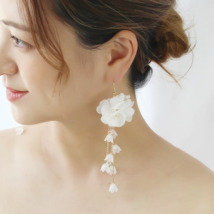 ふわふわのシフォンフラワーに、さらさらとチェーンが揺れ動くロマンティックなデザインのピアス。チェーンにはすりガラスのようなすずらんモチーフ。幸福を花言葉に持つすずらんは、ブライダルなど特別なシーンにもぴったりです。