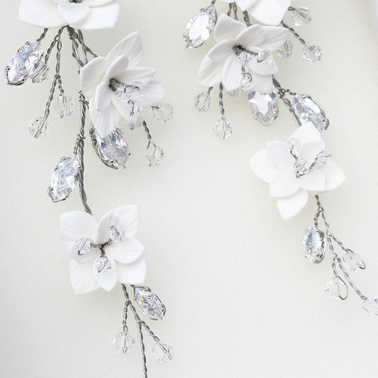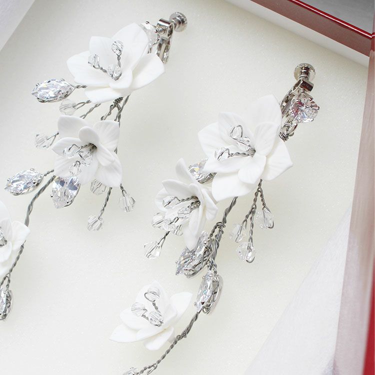 ワイヤーで枝垂れるようなデザインに仕上げた、ブライダルシーンに人気の小枝アクセサリー。軽やかな樹脂製のお花が咲き乱れ、大粒キュービックジルコニアの葉が煌めく華やかな大ぶりのイヤリングです。