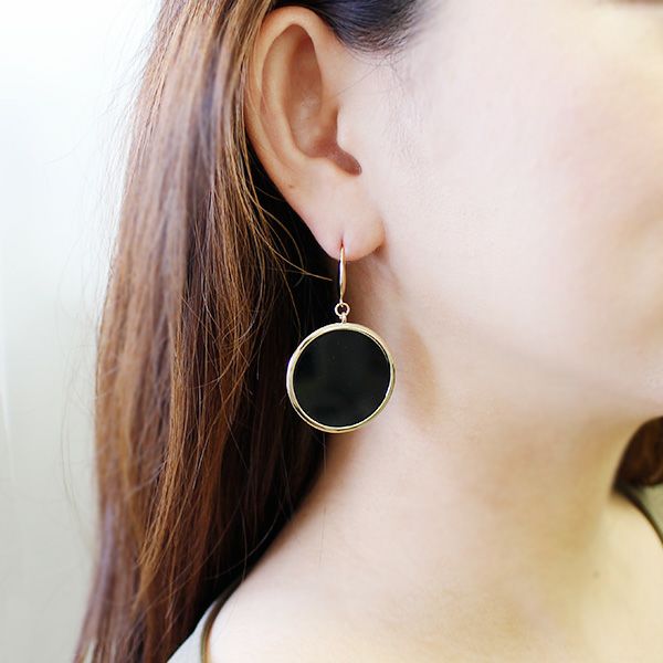 ブラックとゴールドの配色が大人かっこいいフックピアス。 シンプルなブラックの裏は花柄にメタルがくり抜かれ、動くたびに違う表情をのぞかせます。