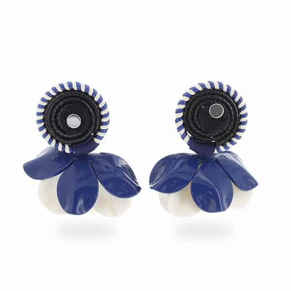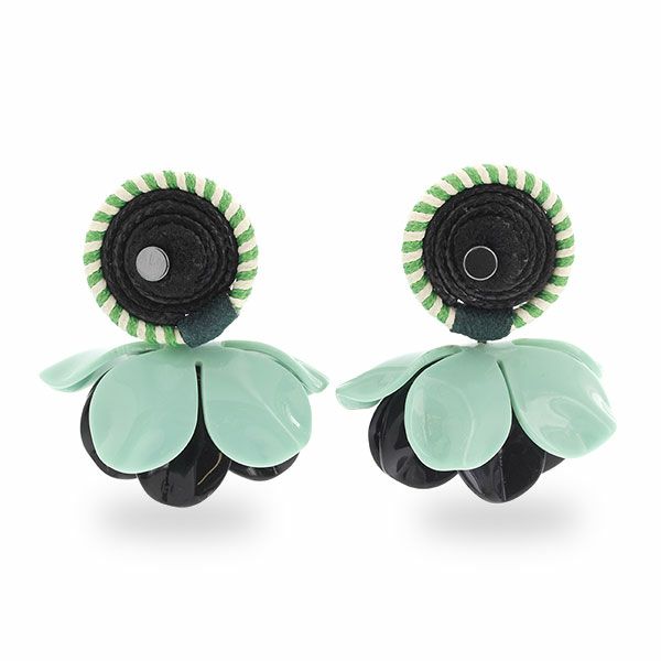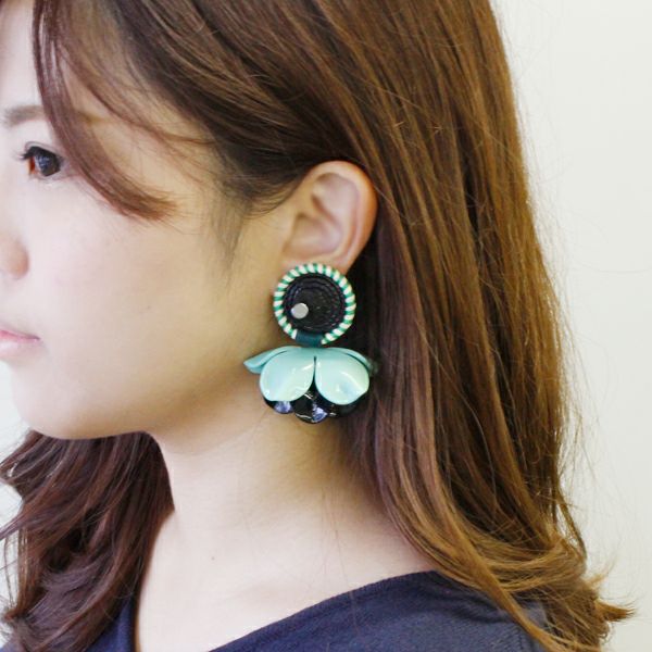渦巻きのようにデザインされたレザーの下には、揺れる花びらが施され、他にはない個性的でオシャレなデザインです。アクリル素材を使用しているため、大ぶりなのに軽いのもポイント!