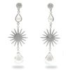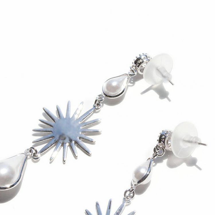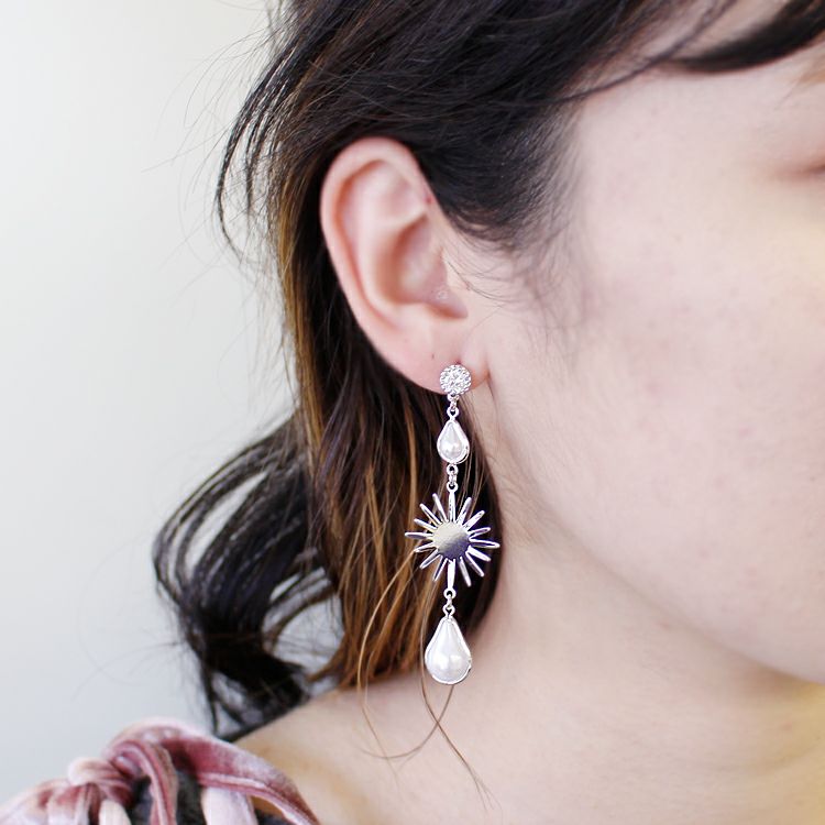 太陽のようなモチーフをパールで挟んだ明るくインパクトのあるピアス。ゆらゆら揺れるロングピアスは顔周りを華やかにしてくれて、かつ小顔効果も期待できます。