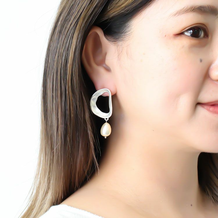 マットな質感のメタルにバロックパールを合わせたピアス。ナチュラルで丸みのあるシルエットでありながら、大胆なハンマー加工の凹凸が施され、甘すぎない印象に。エレガントなファッションには凛とした印象を、辛口ファッションには柔らかさを加えてくれるアイテムです。