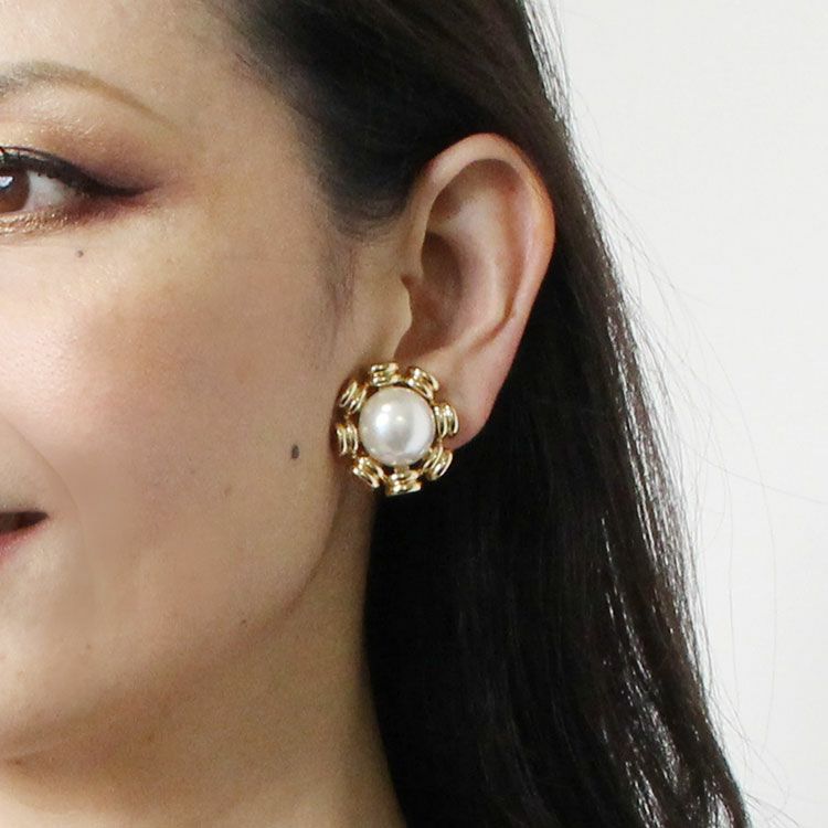 大粒のカボションパールがお顔周りを華やかにし、メタル使いがあることでカジュアルから上品コーデまで出番の多いイヤリング。