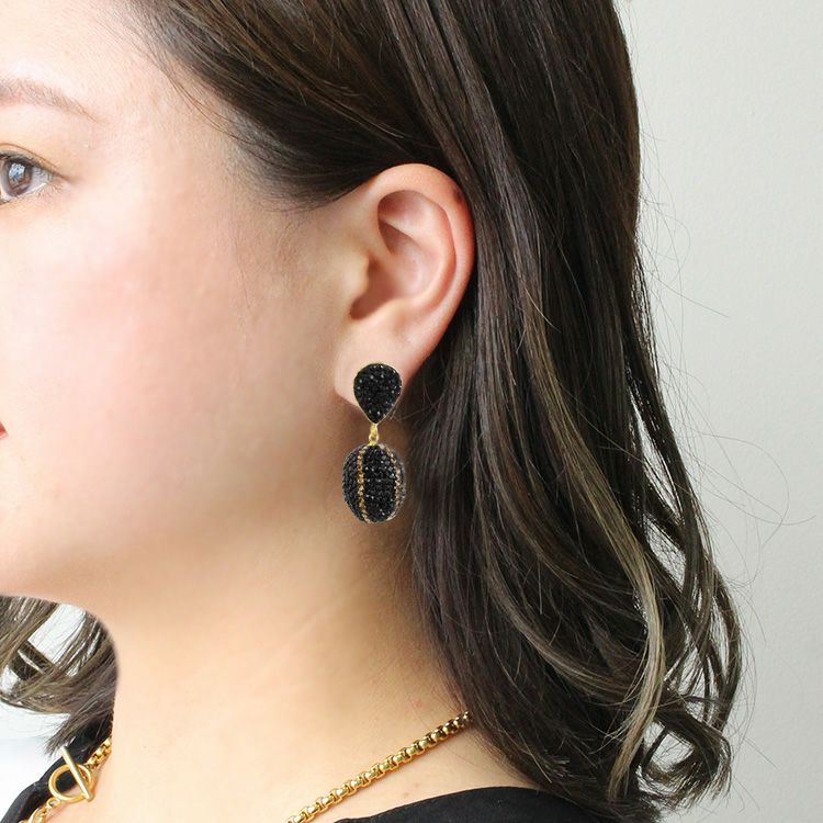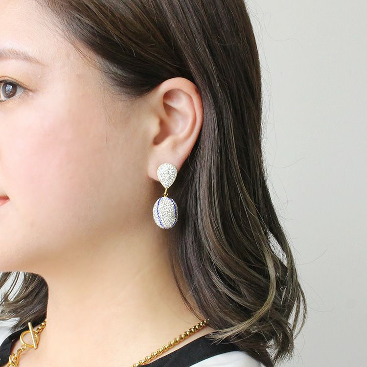 クリスタルガラスがたっぷりとあしらわれ、動くたび、光がわずかに当たるたびにキラキラと煌めくピアス。