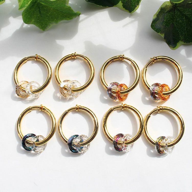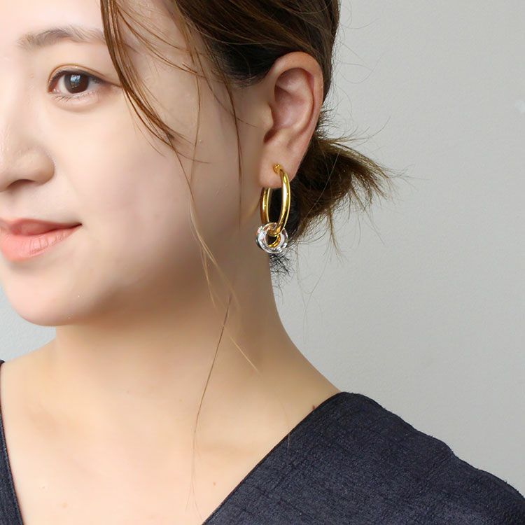 サークルのクリスタルが煌めくフープイヤリング。イヤリングながらピアスのように見える人気のフープタイプです。装いを選ばず使いやすい、必ずひとつは持っておきたいデザイン。揺れるモチーフは取り外しが出来るので、2wayでお楽しみいただけます。