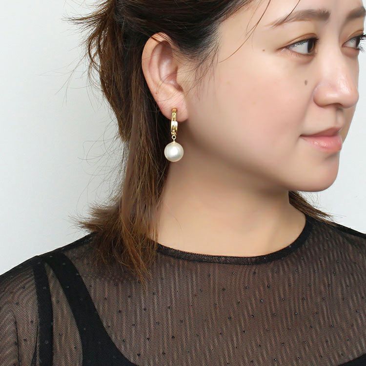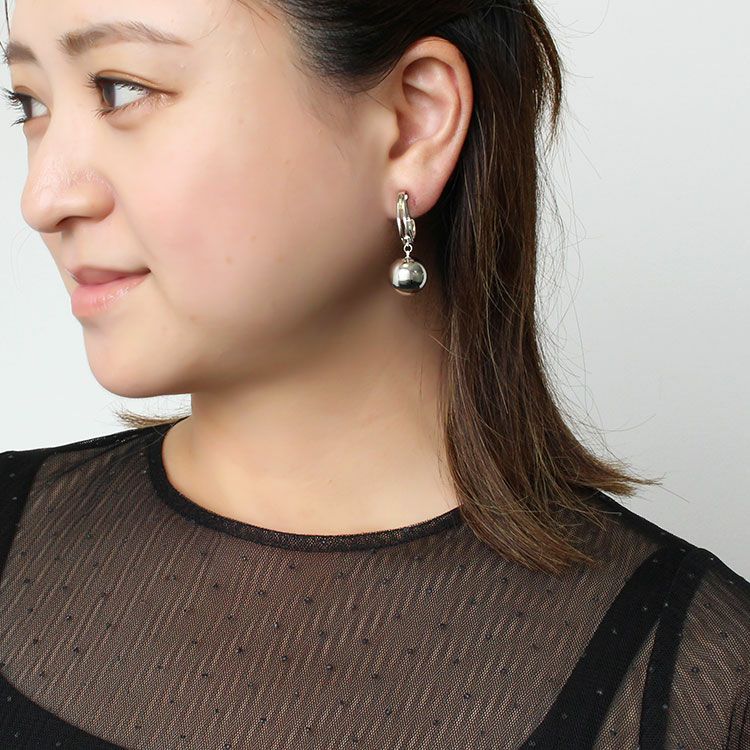パールとメタルボールロングイヤリング。アシンメトリーなデザインがクールでスタイリッシュなデザインです。