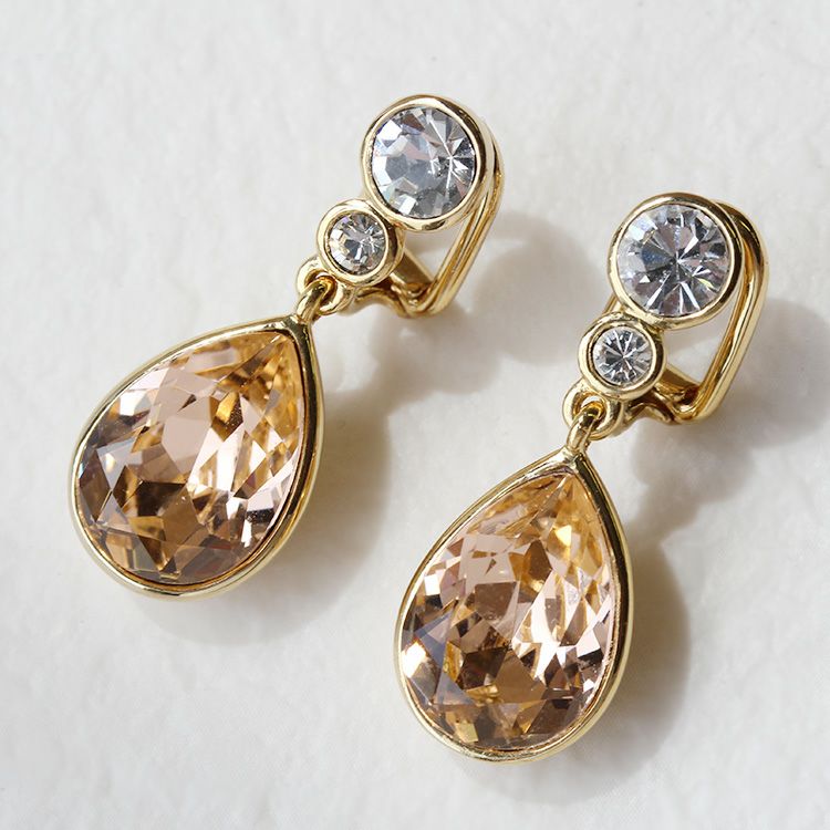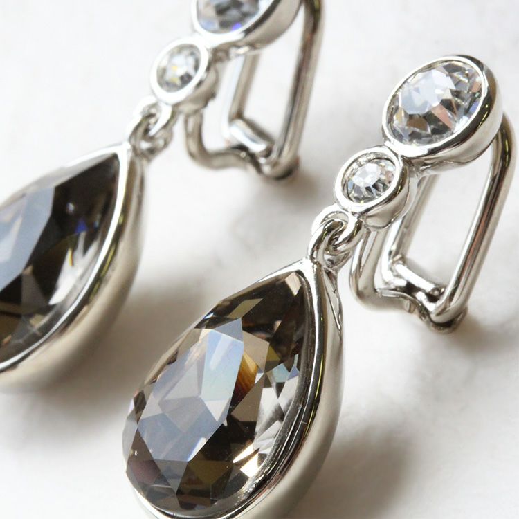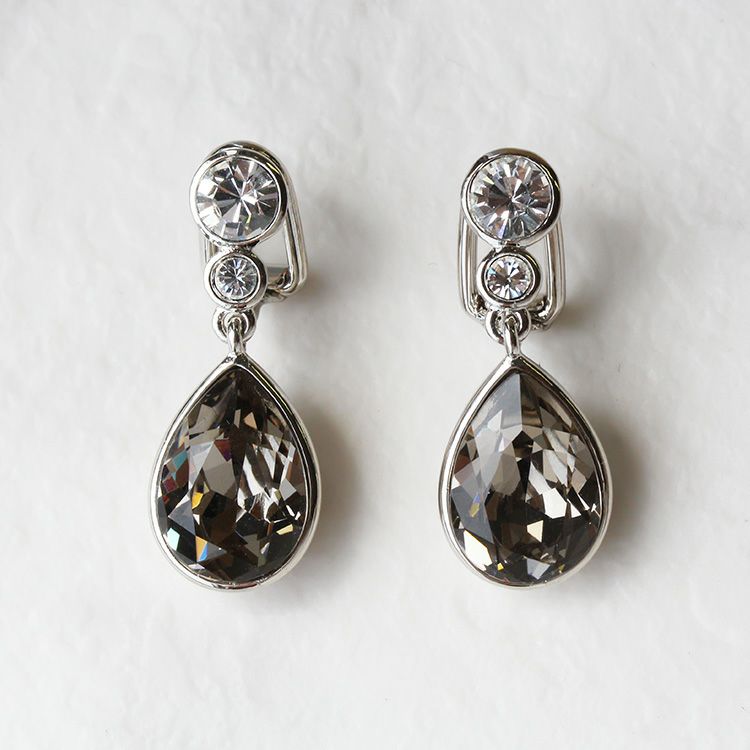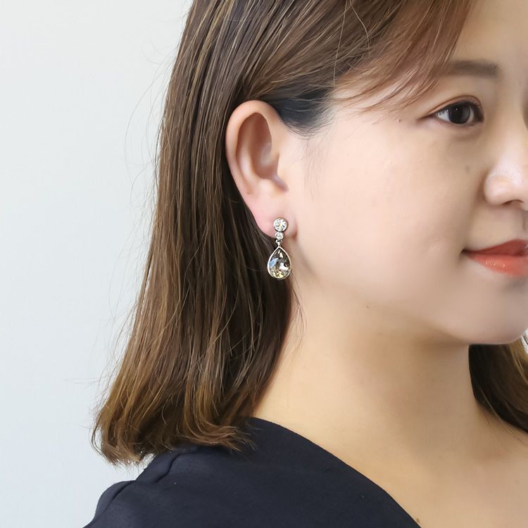 丸と雫型のクリスタルガラスが水滴のようなイヤリング。品があり、丸みのあるデザインと揺れ感がどこか儚げながら、大粒ドロップクリスタルの輝きが華やかさを与えてくれます。