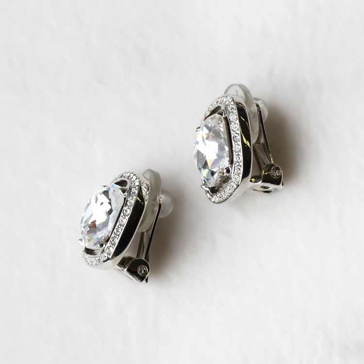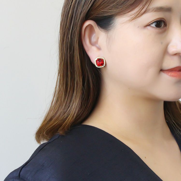 大粒のビジューが華やかなイヤリング。四角形の角を落としたクッションカットは、スクエアの持つシャープで凛とした印象と、柔らかい印象を併せ持つジュエリーでも人気のシェイプ。どんな洋服にも合わせやすく、デイリーから特別なお出かけまで幅広く活躍してくれます。光の反射が美しいので、ブライダルシーンやステージ衣装などにもオススメ。