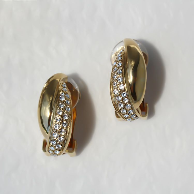 シーンや年代を選ばずご愛用いただける、エレガントなデザインのメタルイヤリング。艶のあるゴールドメタルとパヴェ状に配されたクリスタルガラスの輝きが、シンプルながらも装いのアクセントに。