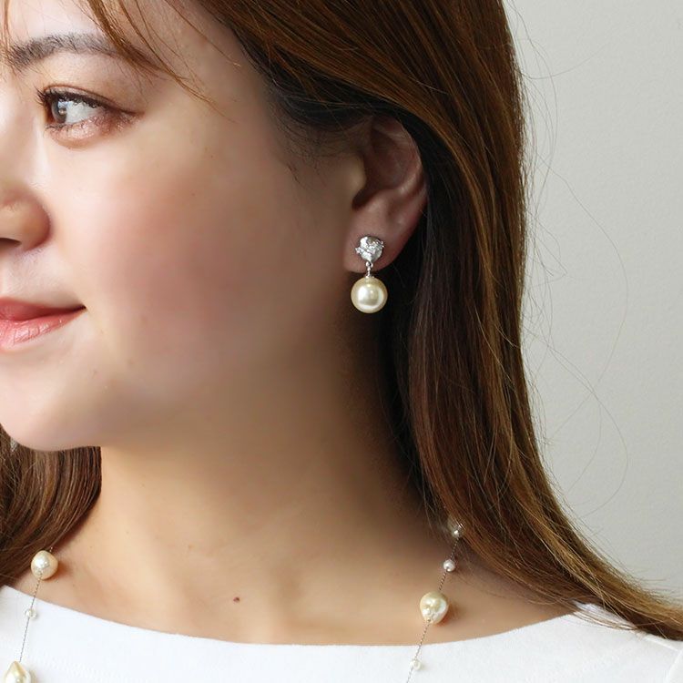 大粒のガラスパールがしなやかに揺れるデザインイヤリング。メタル部分に斜めラインにデザインされたキュービックジルコニアが耳元を華やかに演出してくれます。普段使いからパーティーシーンまで幅広くお使いいただけます。