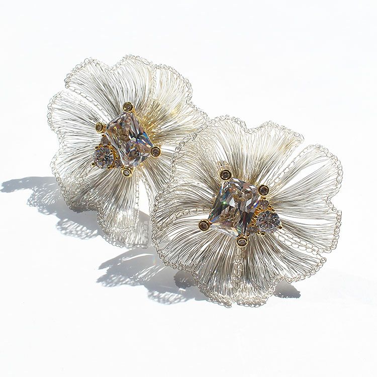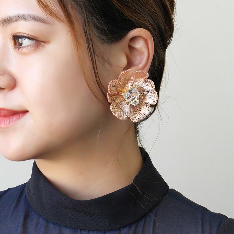 コッパーワイヤーを繊細な手仕事でお花のように編み上げたフラワーモチーフ×ビジューイヤリング。しっかりとした艶感がありながらも、しなやかな表面感が魅力的なデザインはまるで芸術作品のような美しさ。中心に煌めくキュービックジルコニアがより華やかさをUPさせています。 パーティーや会食、女子会、カジュアルシーンなど幅広くご利用いただけます。