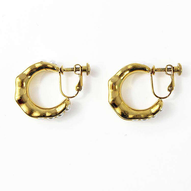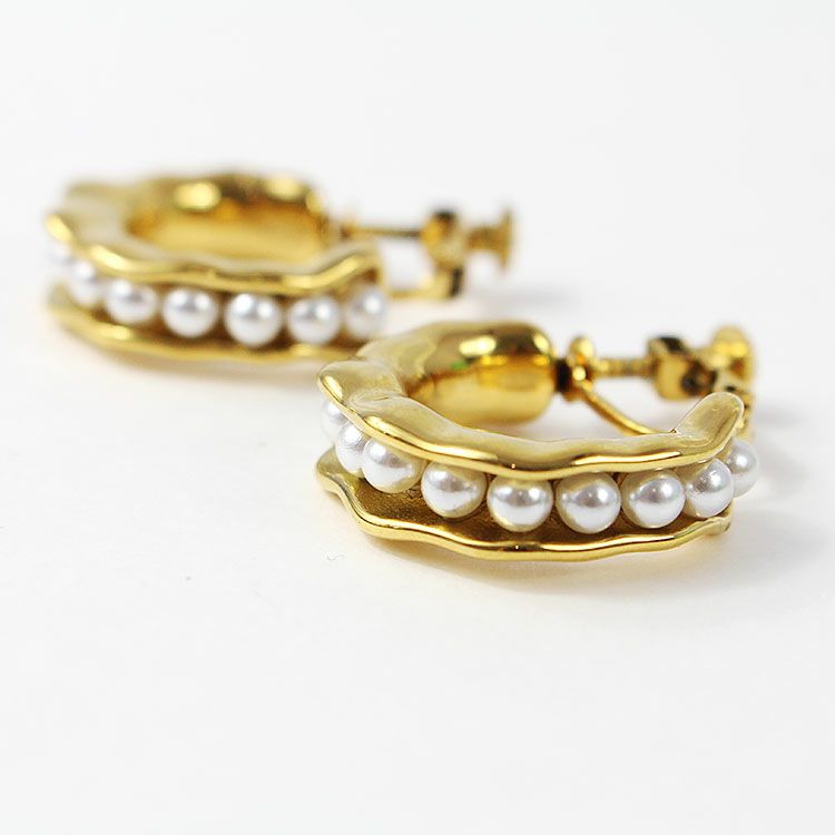 ハーフフープの間にパールを一列に配置したメタルハーフフープイヤリング。 おしゃれで華やかなデザインは、女子会やお買い物などのデイリー使いから、パーティーシーンまで幅広くご利用いただけます。ステンレス素材を使用しているので変色しづらく季節を問わずつけやすいのが特徴です。
