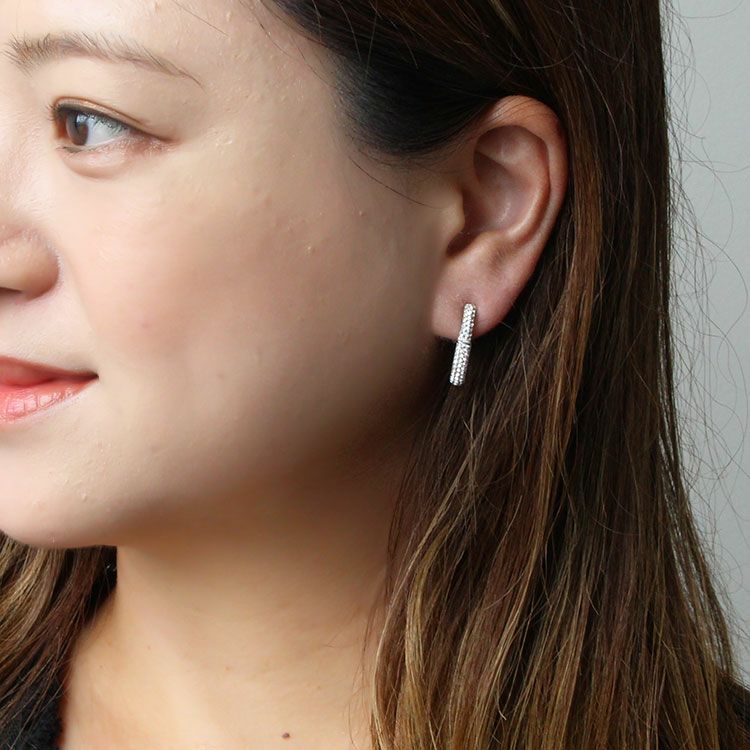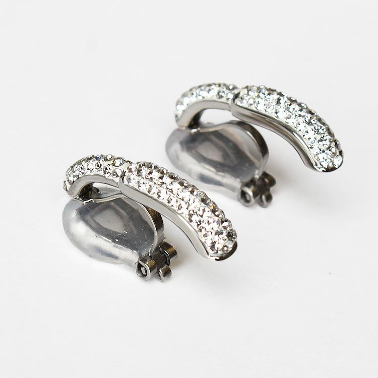ハーフフープのデザインイヤリング。チェコクリスタルがパヴェ状に敷き詰められた華やかなデザイン。お顔まわりに煌めきをあたえてくれます。ステンレス素材を使用しているので変色しづらく季節を問わずつけやすいのが特徴。女子会やお買い物はもちろん、オフィス使いやオケージョンシーン、パーティーシーンにもおすすめです。