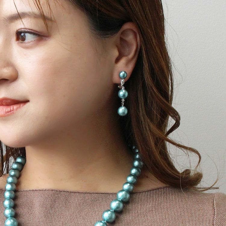 綿を圧縮して形成し、その上からパール塗装を施して作られるコットンパールは、繊維による細かい凹凸が特徴で、温かみのある質感を醸し出しています。驚くほどの軽さと、ひとつ一つが真円ではなく、少し歪んだ形状をしていることも、ナチュラルな魅力となっています。