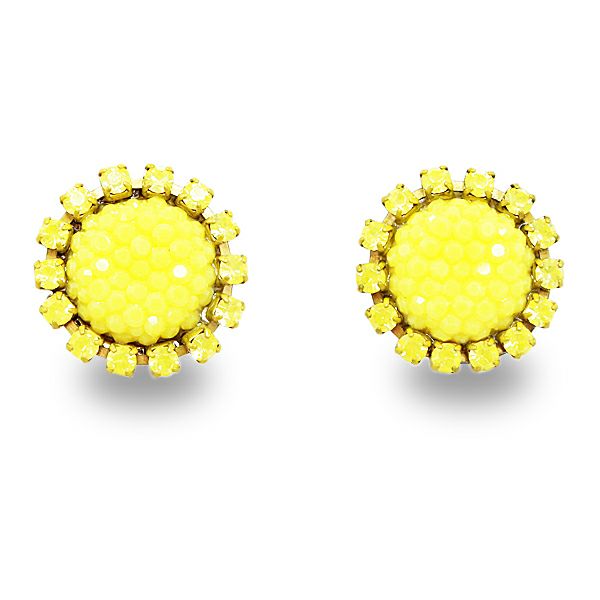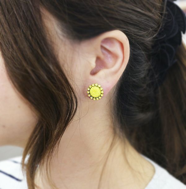 小さなお花のように見えるプチピアス。小さいながらも鮮やかカラーで耳元のアクセントに。外側と内側で2種類のクリスタルガラスを使用しているので、輝きの違いもポイントです。