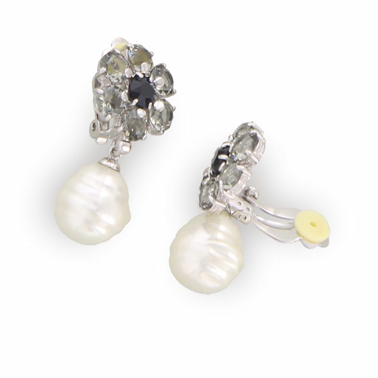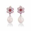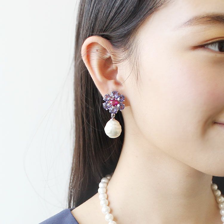 キュービックジルコニアでデザインされたフラワーモチーフに、しずく型のバロックパールをあしらったエレガントなデザイン。お揃いのネックレスと合わせれば、更に華やかに♪