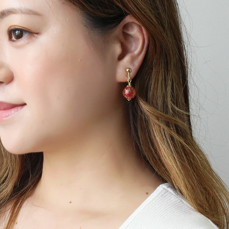 金属の粒子が細かいラメ状の煌めきになって漂う、イタリア・ムラーノ島で生み出された伝統的技法のビーズを使用したイヤリング。ゆらゆらと漂う唯一無二の模様は、職人が作り出すガラス製品ならではの美しさです。