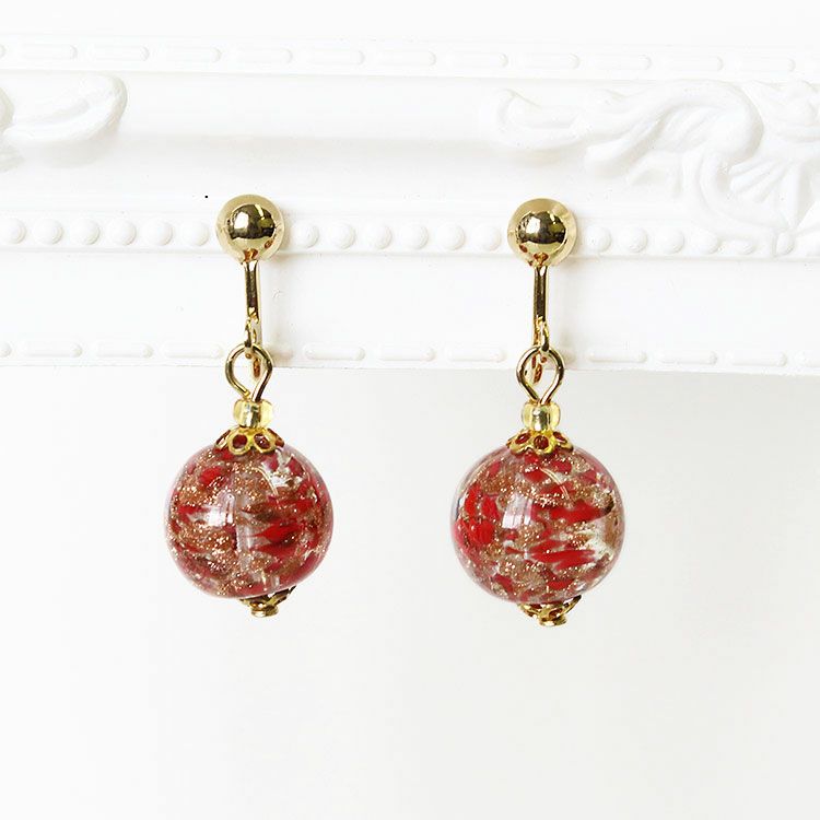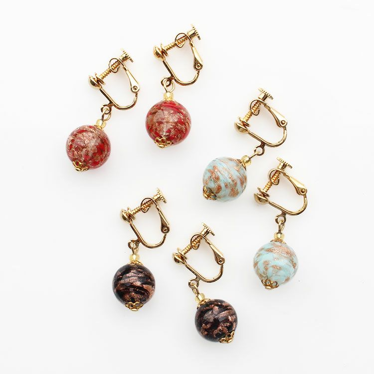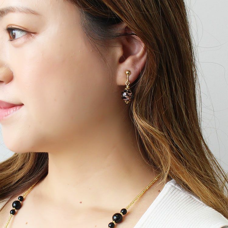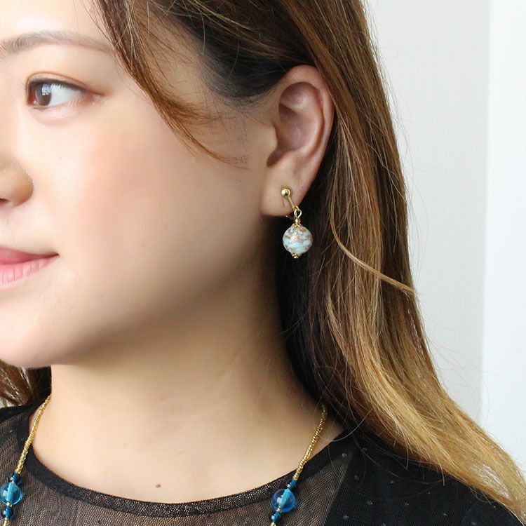 金属の粒子が細かいラメ状の煌めきになって漂う、イタリア・ムラーノ島で生み出された伝統的技法のビーズを使用したイヤリング。ゆらゆらと漂う唯一無二の模様は、職人が作り出すガラス製品ならではの美しさです。