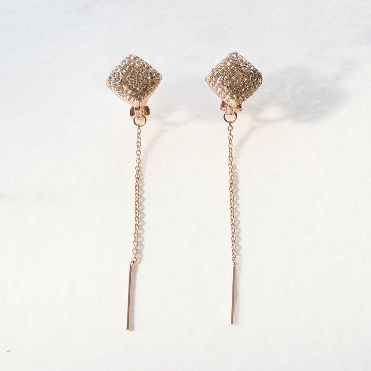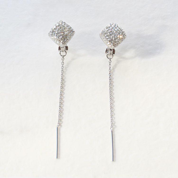 スクエアモチーフにはチェコクリスタルがパヴェ上に敷き詰められており耳元に煌めきをあたえてくれます。モチーフの奥でぶら下るロングチェーンのゆったりした揺れ感が女性らしさを引き立てます。