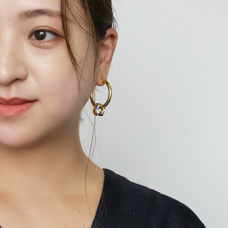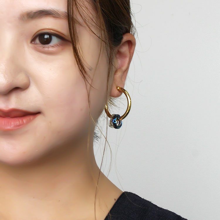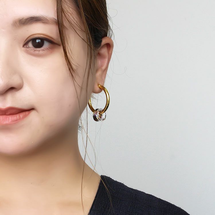 サークルのクリスタルが煌めくフープイヤリング。イヤリングながらピアスのように見える人気のフープタイプです。装いを選ばず使いやすい、必ずひとつは持っておきたいデザイン。揺れるモチーフは取り外しが出来るので、2wayでお楽しみいただけます。