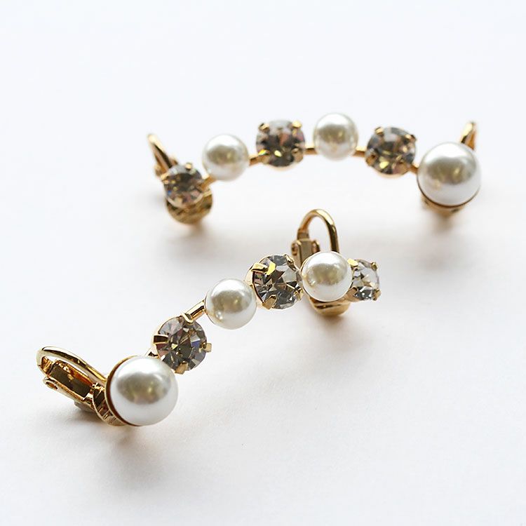 パールとクリスタルガラスを交互にあしらったキラキラ煌めく両耳用のイヤ-カフ。サイドから耳たぶを挟む耳に沿うようなデザインでラグジュアリーな雰囲気を演出します。左右の上下を逆にしてパールを上にしたり、クリスタルガラスを上にした2Wayでご使用いただけます。服装に合わせてカジュアルシーンからフォーマルなシーンまで幅広くご利用いただけます。 イヤカフ(左右セット)、真鍮、クリスタルガラス、