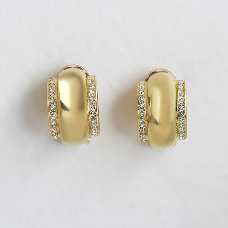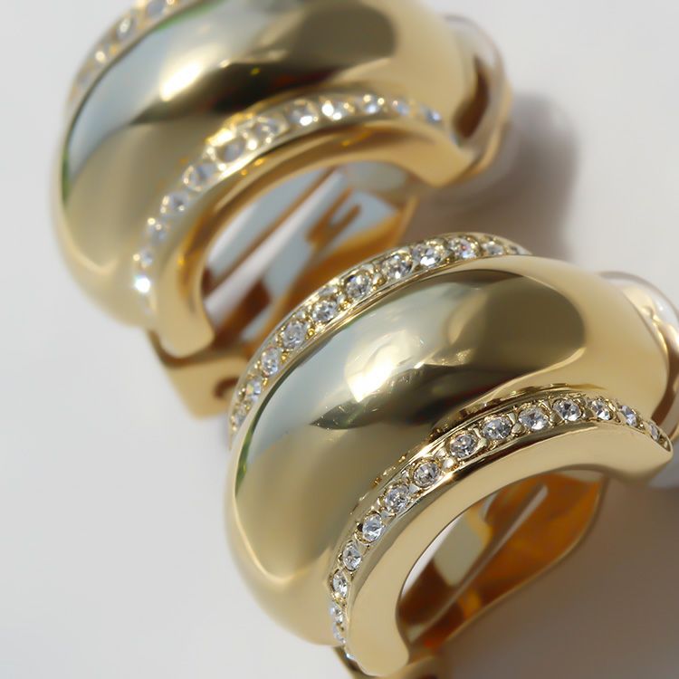 ぽってりとしたゴールドのハーフフープイヤリング。サイドのクリスタルガラスがデザインの輪郭を強調し、印象を引き締めつつ華やかさをプラスしています。