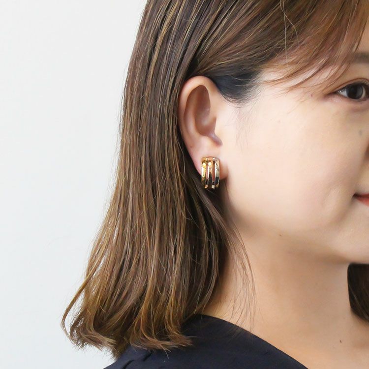 シルバー、ゴールド、ピンクゴールドのメタルが三位一体となったイヤリング。正面からは規則正しく並ぶ直線的でスタイリッシュなデザイン、横から見ると柔らかさのあるハーフフープ状のデザイン。定番人気のシンプルな地金アクセサリー、かつクラス感があり、シーンや年代を選ばずご愛用いただけます。