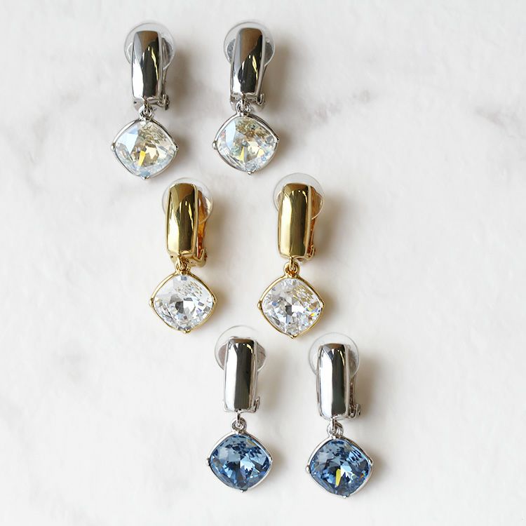 大粒のビジューが華やかなイヤリング。四角形の角を落としたクッションカットは、スクエアの持つシャープで凛とした印象と、柔らかい印象を併せ持つジュエリーでも人気のシェイプ。スタイリッシュなメタルのバーと合わせた、どんな洋服やアクセサリーとも合わせやすいデザインです。