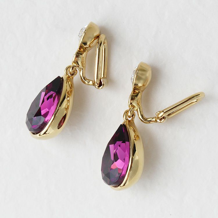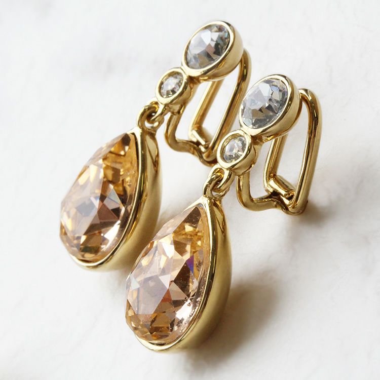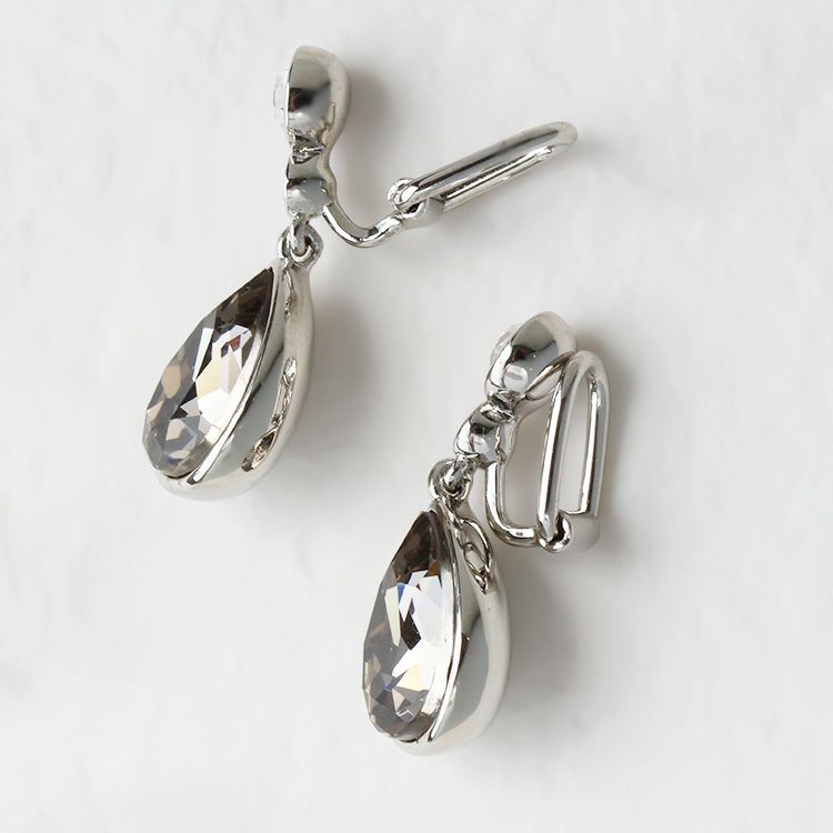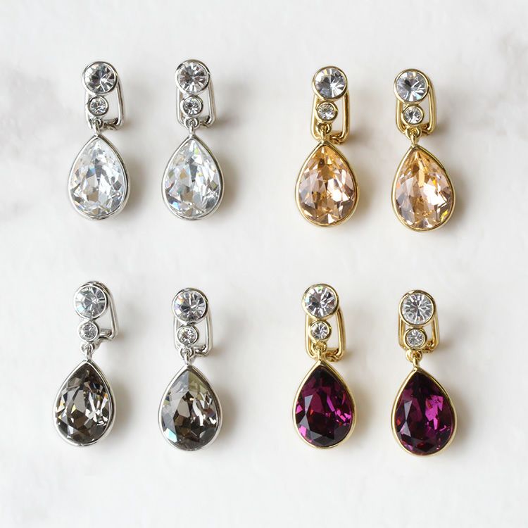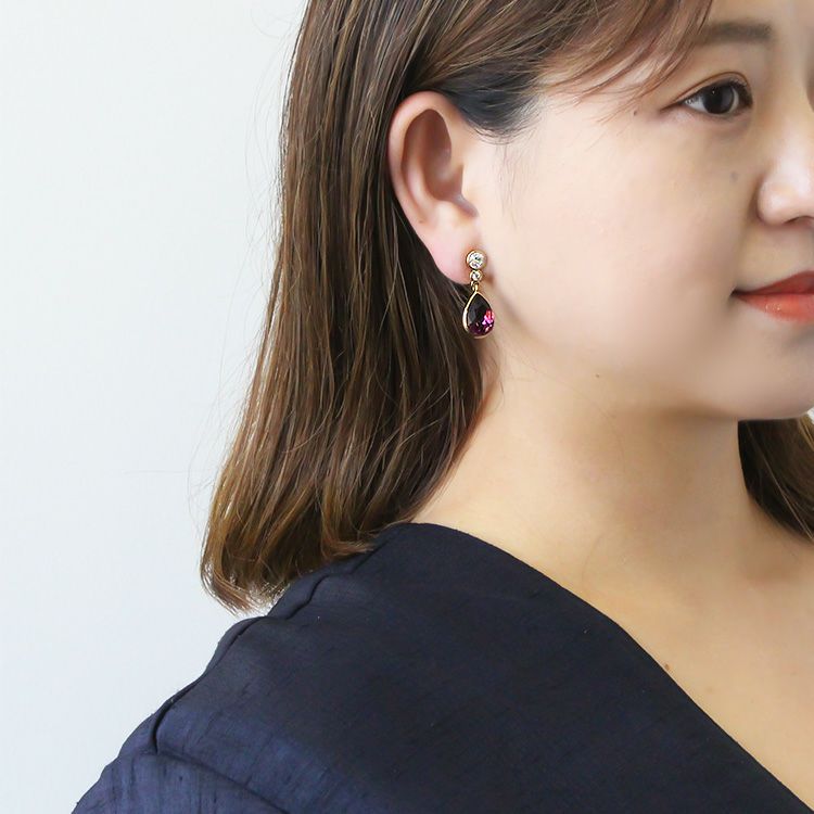 丸と雫型のクリスタルガラスが水滴のようなイヤリング。品があり、丸みのあるデザインと揺れ感がどこか儚げながら、大粒ドロップクリスタルの輝きが華やかさを与えてくれます。