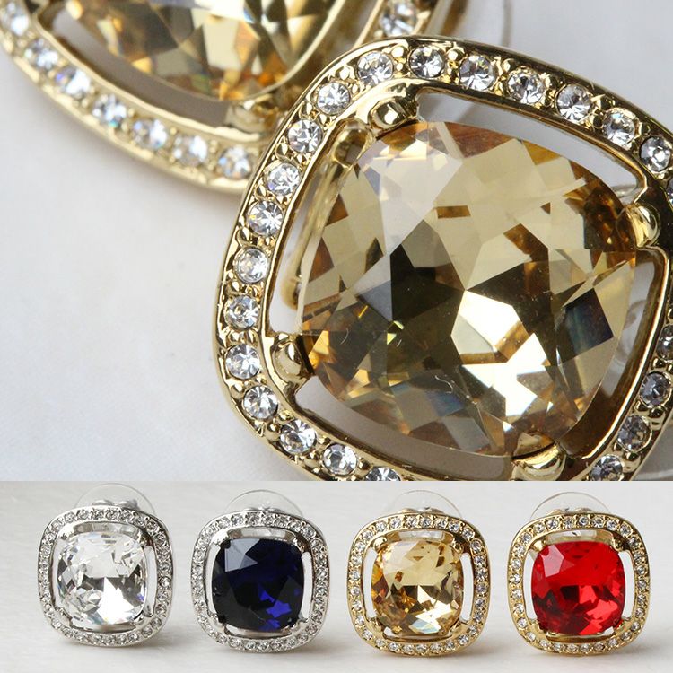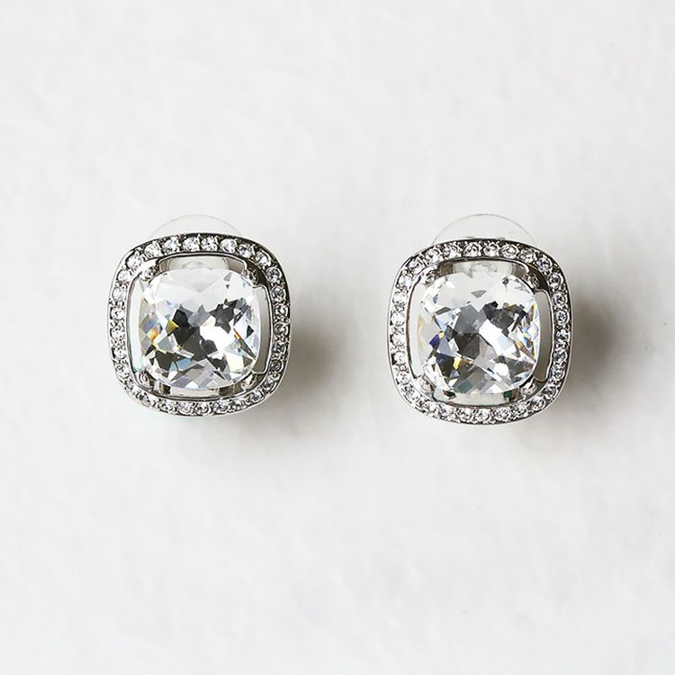 大粒のビジューが華やかなイヤリング。四角形の角を落としたクッションカットは、スクエアの持つシャープで凛とした印象と、柔らかい印象を併せ持つジュエリーでも人気のシェイプ。どんな洋服にも合わせやすく、デイリーから特別なお出かけまで幅広く活躍してくれます。光の反射が美しいので、ブライダルシーンやステージ衣装などにもオススメ。