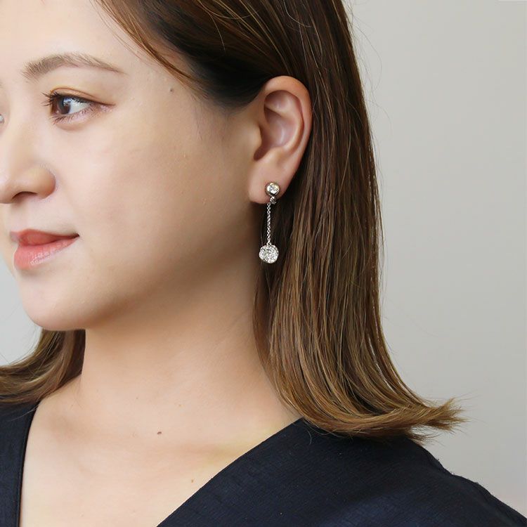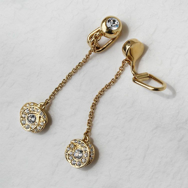 繊細なチェーンの先にチェコガラスを敷き詰めたバラのモチーフが揺れるイヤリング。華やかさはありつつ品の良いデザインです。